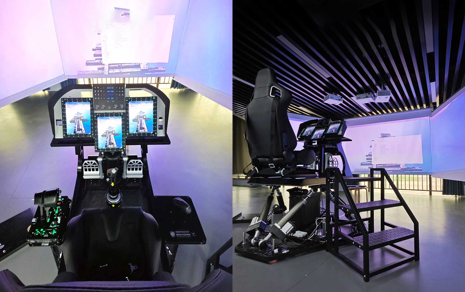 六自由度平台模拟飞行姿态变化,座舱内置空战对抗系统。支持双人联机对抗,可设置敌机、导弹等 战场元素,适用于飞行对抗战术训练与体验。